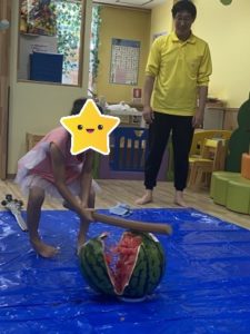 目隠しをして、スイカの位置を教えてあげるというみんなに与えられたミッションも