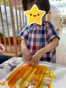 1歳児さんは絵具をロールで